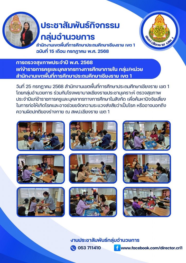 การตรวจสุขภาพประจำปี พ.ศ. 2568 แก่ข้าราชการครูและบุคลากรทางการศึกษาภายใน กลุ่ม/หน่วย สพป.เชียงราย เขต 1